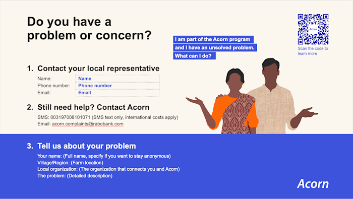 As an Acorn Local Partner, you're required to communicate the grievance mechanism to participating farmers. The files on this page assist you in this.