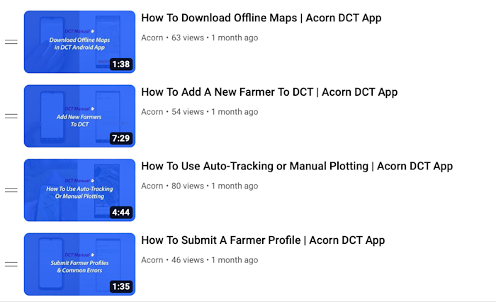 To kick off farmer data collection, we've put together a series of YouTube tutorials on navigating Acorn's Data Collection Tool (DCT). These should serve as handy guides for field technicians and data collectors.