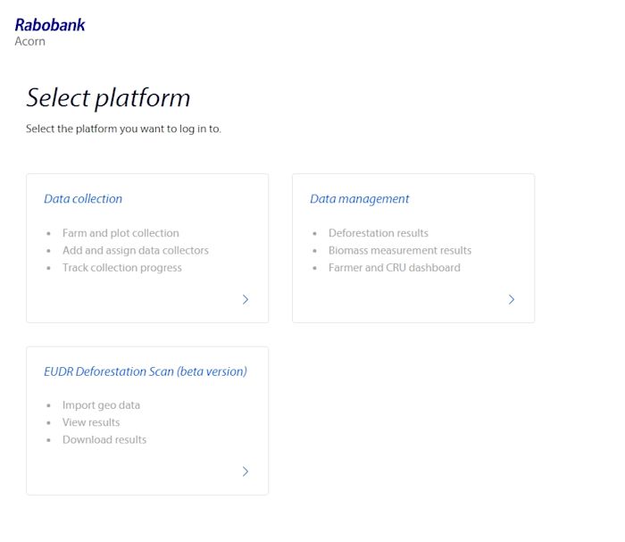 The portal helps you manage various aspects of the project, from data collection to farmer payouts. Use the 'Data Collection' tile for information on data gathering, and the 'Data Management' tile for insights into deforestation cases of your project, CRU generation, and payouts.